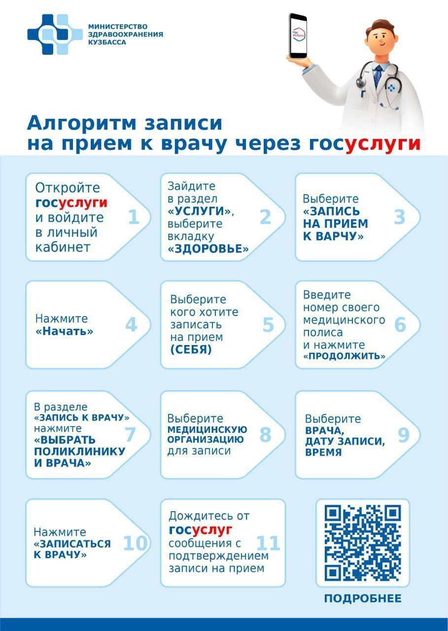 10 простых шагов для записи на прием к врачу через Госуслуги (https://www.gosuslugi.ru/).